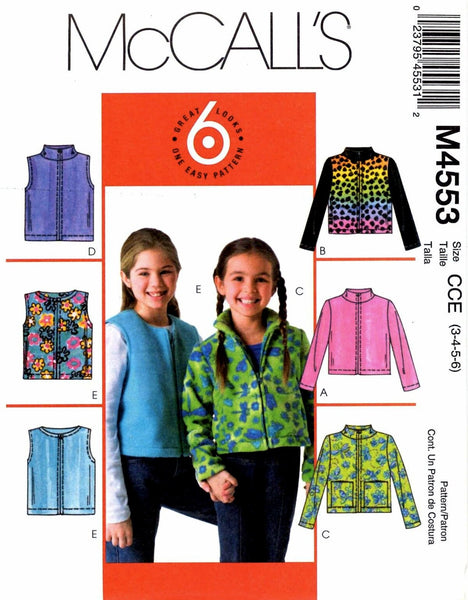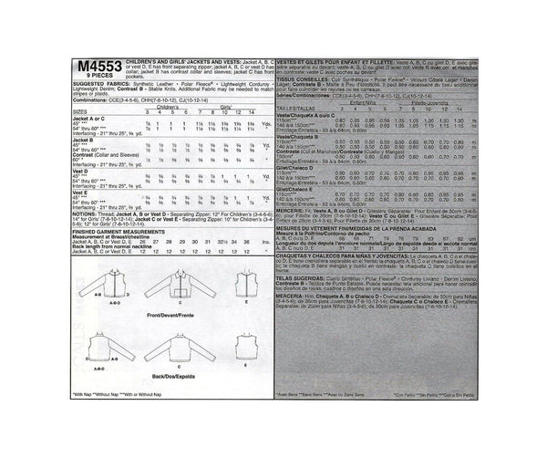 Jacket A, B, C or vest D, E has front separating zipper: jacket A, B, C or vest D has collar; jacket B has contrast collar and sleeves, jacket C has front pockets.