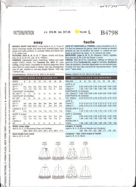 Lined skirts A,B,C,D are 2" below mid-knee length and have front inverted pleat, back zipper and ruffle variations; A: contrast ruffles and ribbon trim. C,D: ribbon belt.