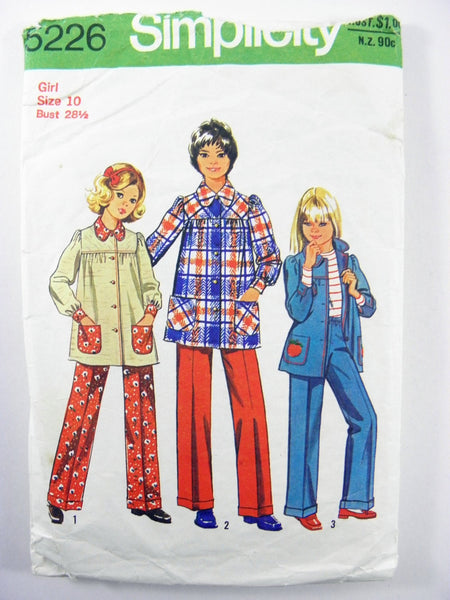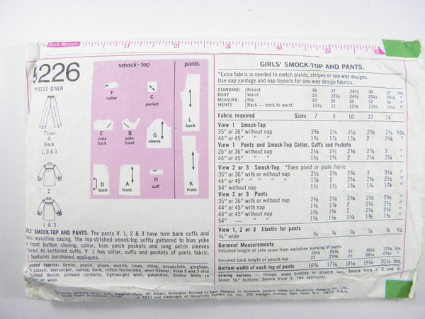 The pants V 1, 2 & 3 have turn back cuffs and elastic waistline casing. The top-stitched smock-top softly gathered to bias yoke has front button closing, collar, bias patch pockets and long set-in sleeves gathered to buttoned cuffs. V 1 has collar, cuffs and pockets of pants fabric. V 3 features purchased appliques.