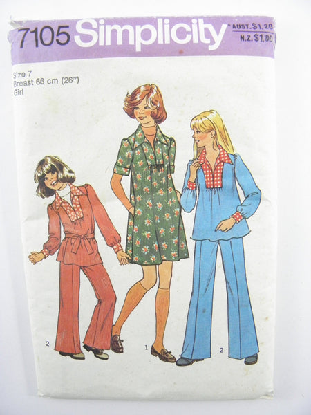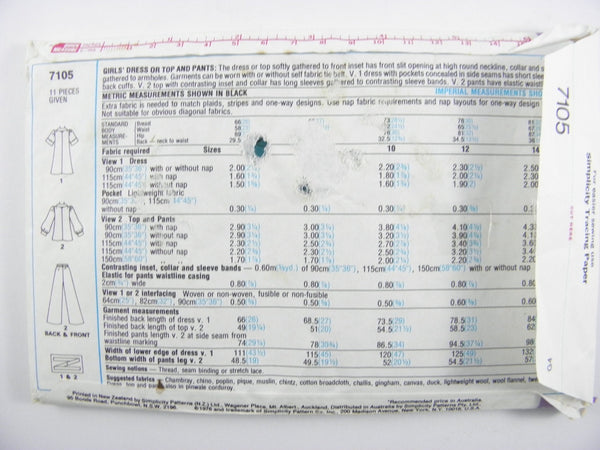 Dress or top slightly gathered to front inset has front slit opening at high round neckline, collar and set-in sleeves gathered to armholes. Can be worn with self tie belt. Dress has option of pockets in side seams and short sleeves with turn back cuffs or long sleeves gathered to sleeve bands. Pants have elastic waistline casing.