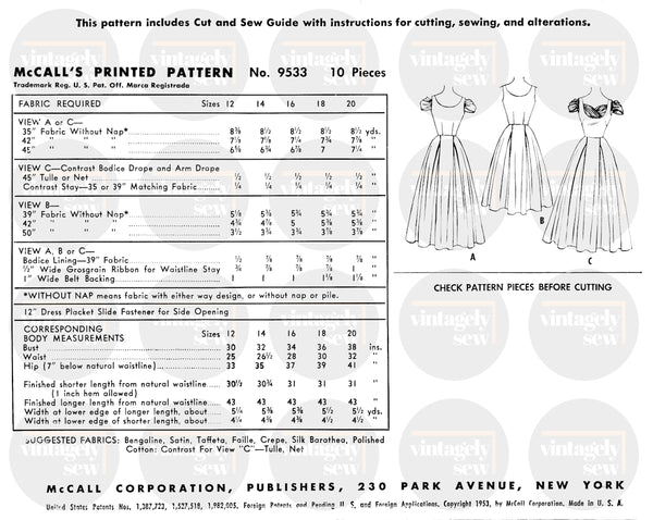 This vintage McCall's 9533 evening dress sewing pattern has been professionally reproduced and printed to exact scale on certified carbon neutral white paper, neatly folded and comes with full original instructions, colour cover sheets and a zip lock sleeve for protection against dust and moisture.