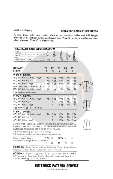 This vintage 1960s Butterick 4983 sewing pattern has been professionally reproduced and printed to exact scale on certified carbon neutral white paper, neatly folded and comes with full original instructions, colour cover pictures, and a zip lock sleeve for protection against dust and moisture.
