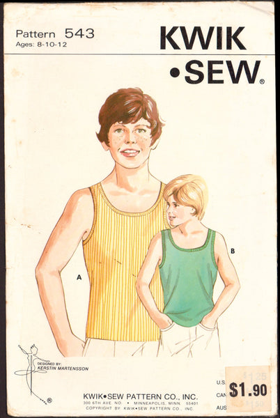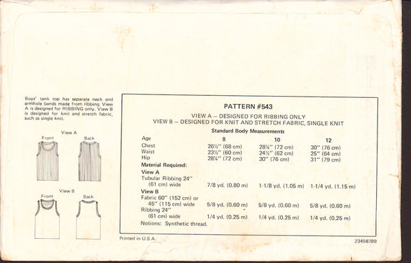 Boy's tank top has separate neck and armhole bands made from ribbing. View A is designed for ribbing only. View B is designed for knit and stretch fabric, such as single knit.