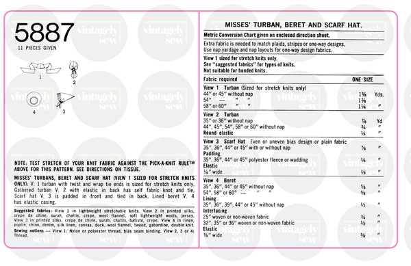 · pattern to create turban with twist and wrap tie ends, gathered turban, scarf hat and lined berets