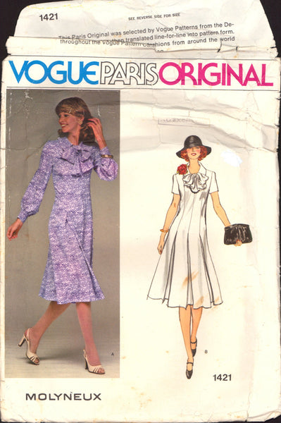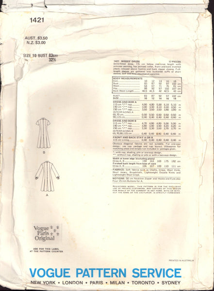 Semi-fitted dress, three inches below mid-knee length with princess seaming, has pointed collar, front and back inverted pleats released above hipline and back zipper closing. Full length sleeves are gathered into buttoned cuffs or short sleeves. Self tied bow attached at neckline.