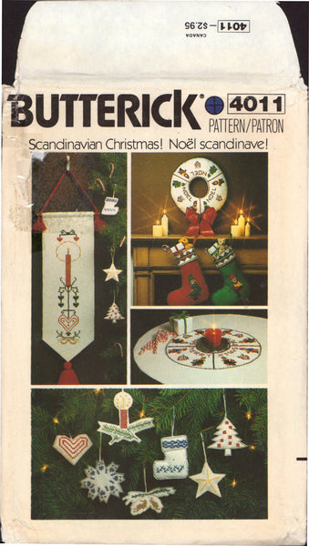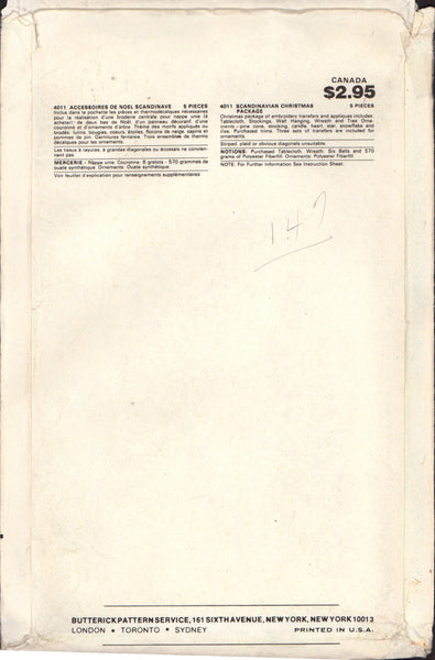 Christmas package of embroidery transfers and applique includes tablecloth (purchased), stockings, wall hangings, wreath and tree ornaments: pine cone, stocking, candle, heart, star, snowflake and tree. Purchased trims. These sets of transfers are included for ornaments.