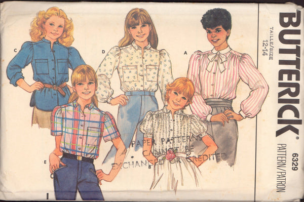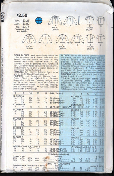 Very loose-fitting blouse has collar variations, back pleated into yoke with forward shoulder seams and short or long sleeves with cuffs. Narrow hem. A: tie contrast. A and B gathered front. Purchased belt. C sleeves rolled up (wrong side shows). shirttail hem. C,D and E patch pockets. E: sleeves are narrow hemmed.