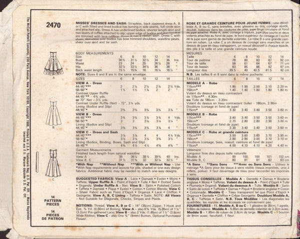 Strapless, back zippered dress A, B, or C with fitted and lined bodice has boning in side seams, full circle skirt and attached slip. Dress A has underlined bodies, shorter length skirt and two layers of ruffles attached to slip; upper edge of bodice and skirt hemline are trimmed with lace ruffling. Dress B has a ribbon sash. Dress C with sheer, sleeveless over-bodice has bow trimmed shoulders, waistline pleats,sheer over-skirt and tie sash.