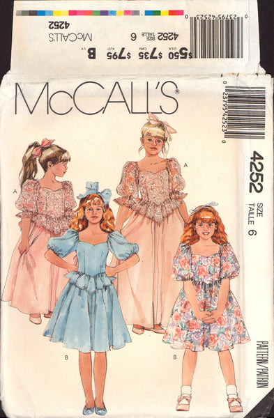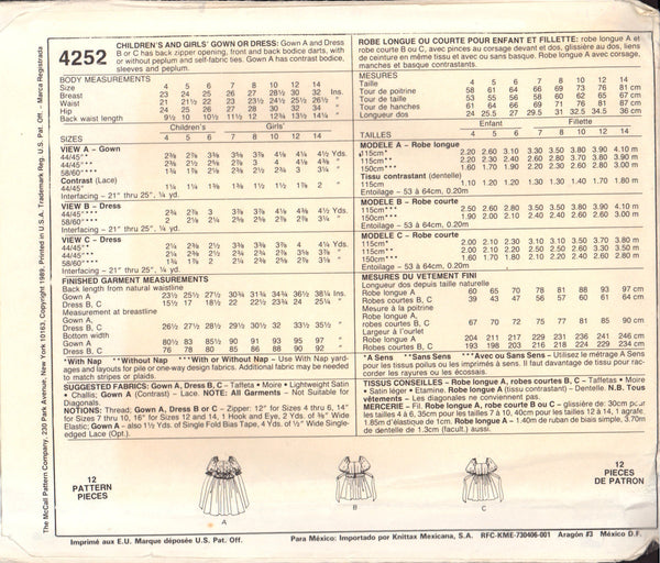 Gown A and Dress B or C has back zipper opening, front and back bodice darts with or without peplum and self fabric ties. Gown A has contrast bodice, sleeves and peplum.