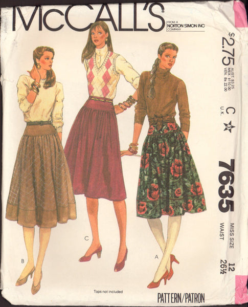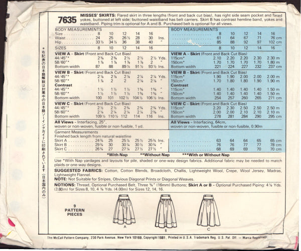 Flared skirt in three lengths (front and back cut bias), has right side seam pocket and faced yokes, buttoned at left side; buttoned waistband has belt carriers. Skirt B has contrast hemline band, yokes, and waistband. Piping trim is optional for A and B. Purchased belt is optional for all views.