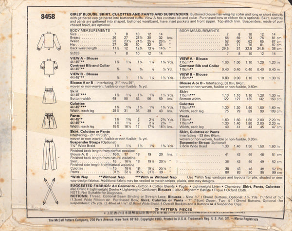 Buttoned blouse has wing tip collar and long or short sleeves with gathered cap into buttoned cuffs. View A has contrast bib and collar. Purchased bow or ribbon tie is optional. Skirt,culottes and pants are gathered into shape, buttoned waistband, have inset pockets and front zipper. Top stitch trim. Suspenders, made of purchased braid,are optional.