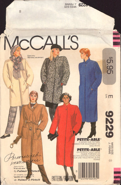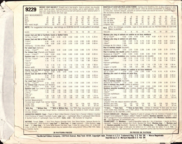 Straight coat in two lengths, lined or unlined, has shoulder pads, stand-up collar, buttoned placket front closing, welt or patch pockets, center back vent, long sleeves, belt carriers and tie belt with optional buckle. Optional button-in liner has edges bound with bias tape.