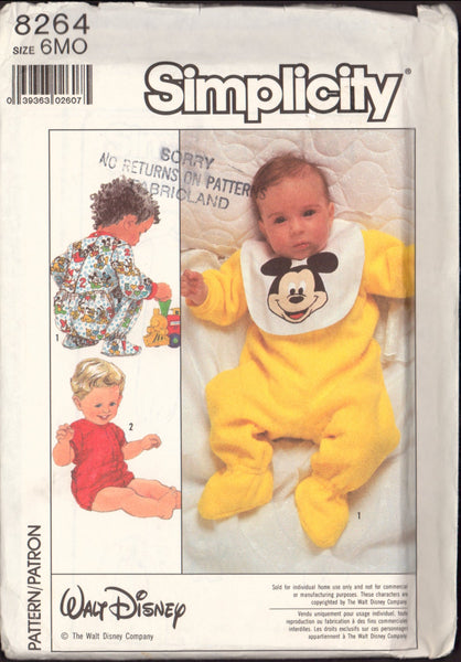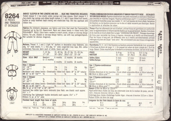 Footed sleeper V1 has elastic ankle casings and long sleeves. Short sleeper V2 has elastic leg casings and elbow length sleeves. V1 and 2 have ribbed knit bands, button or snap fastened back closing, and elasticized flap. Bib has applique and ribbon ties.