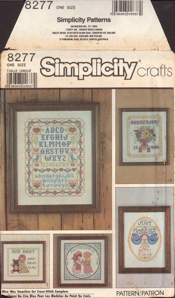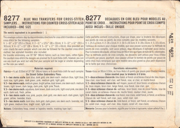This envelope contains step-by-step embroidery directions for cross-stitch transfers or counted cross-stitch for the samplers as listed in picture 3. Colour charts for each sampler and two alphabet transfers included.