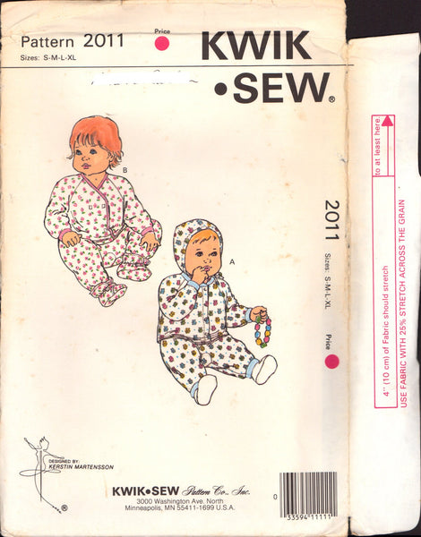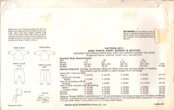 Baby pants, shirt booties and bonnet. Pull on pants with back panel have elastic waist and cuffs. Shirt has long raglan sleeves with cuffs. View A has front snap closure. View B overlaps and has a Velcro closure. Bonnet is double and has self fabric ties. Booties are double and have a Velcro closure.