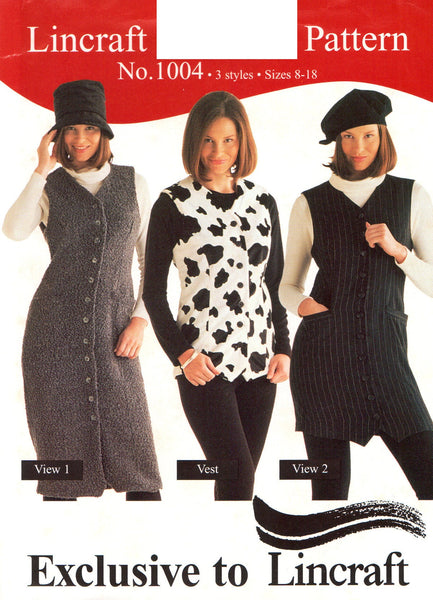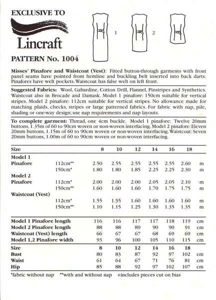 Fitted button-through garments with front panel seams have pointed front hemline and buckling belt inserted into back darts. Pinafores have welt pockets. Waistcoat has false welt on left front.