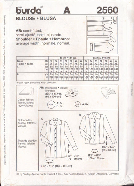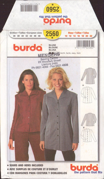 Burda 2560 Sewing Pattern, Women's Blouse, Size 10-22, Uncut, Factory Folded