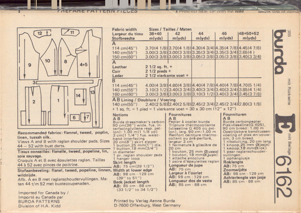 Burda 6162 Sewing Pattern Coat Skirt, Size 12-20 & 40-44 Uncut Factory Folded