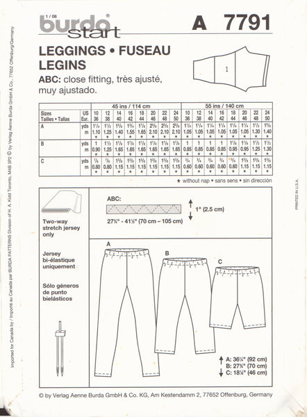 Burda 7791 Sewing Pattern, Leggings, Size 10-24, Uncut, Factory Folded