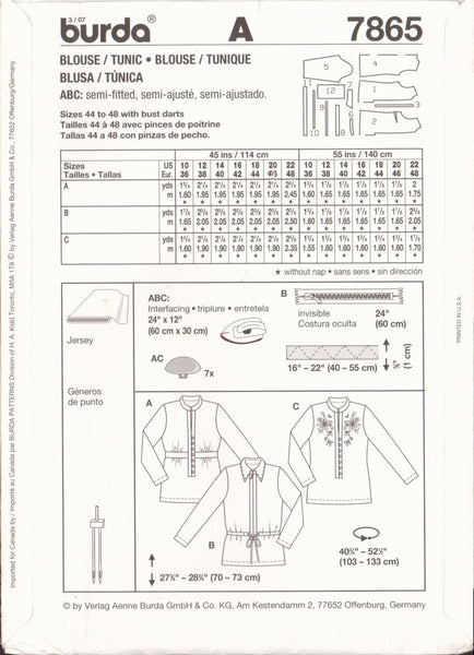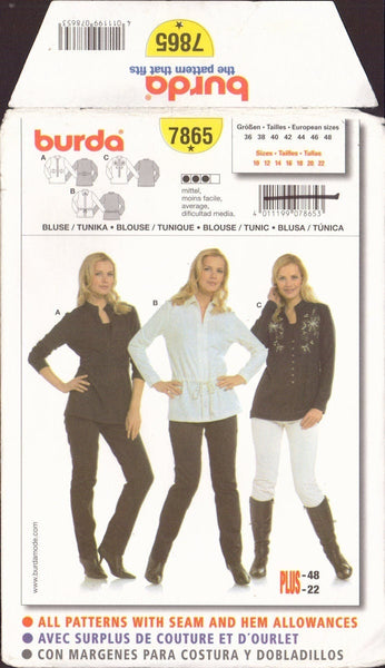 Burda 7865 Sewing Pattern, Women's Blouse, Size 10-22, Uncut, Factory Folded
