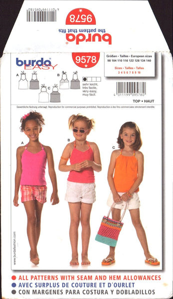 Burda 9578 Sewing Pattern Girls' Top Size 3-10 Uncut Factory Folded