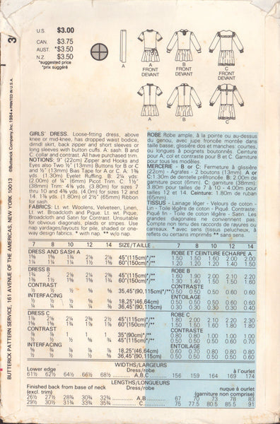 Butterick 3042 Sewing Pattern, Girls' Dress, Size 12-14, Partially Cut, Complete