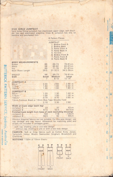 Butterick 3122 Sewing Pattern, Girls' Jumpsuit, Size 7, Cut, Complete