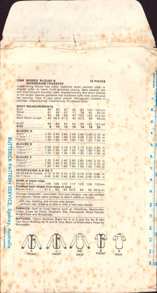 Butterick 3389 Loose Fitting Blouses with Pointed or Shaped Collar and Two Sleeve Lengths, Sewing Pattern Size 10 CUT