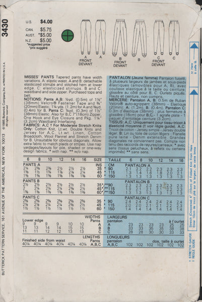 Butterick 3430 Sewing Pattern, Misses' Pants, Size 12-14-16, Uncut, Factory Folded
