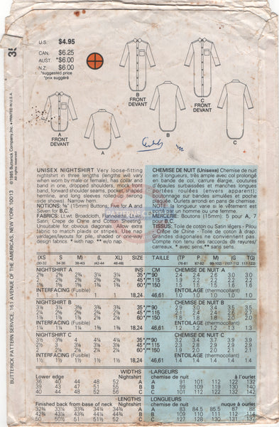 Very loose-fitting nightshirt in three lengths (lengths will vary when worn by male or female), has collar and band in one, dropped shoulders, mock front band, forward shoulder seams, pocket, shaped hemline and long sleeves rolled-up (wrong side shows). Narrow hem.