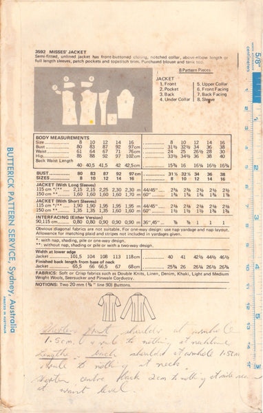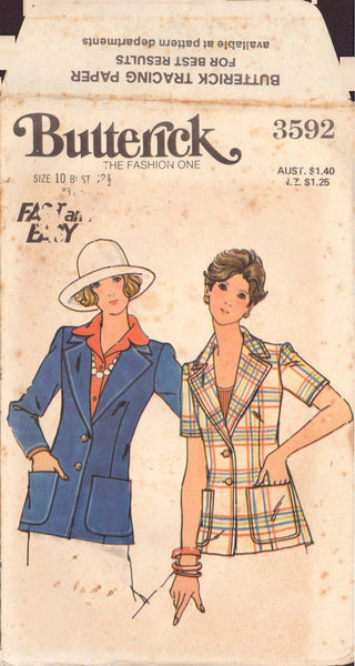 Butterick 3592 Sewing Pattern, Jacket, Size 10, Cut, Complete