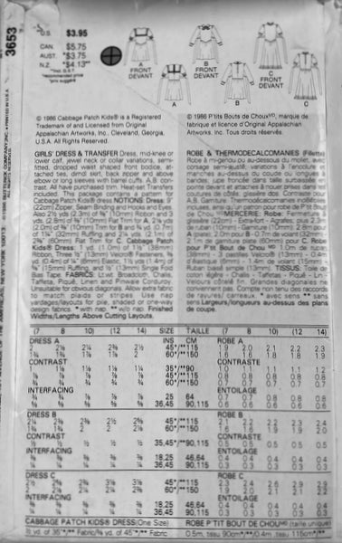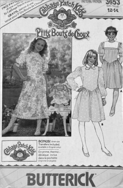 Butterick 3653 Sewing Pattern, Cabbage Patch Kids Doll's Dress, Cut, IncompletePLEASE NOTE: Only the doll's pattern is present. The girl's pattern and the transfer are missing.