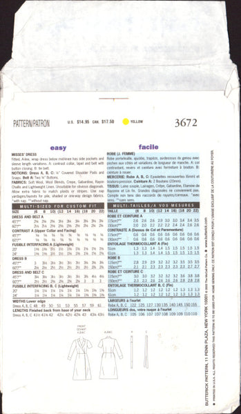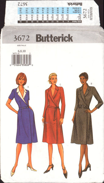 Fitted, A-line wrap dress below mid-knee has side pockets and sleeve length variations. View A contrast collar, lapel and belt with button closing. View B tie belt.