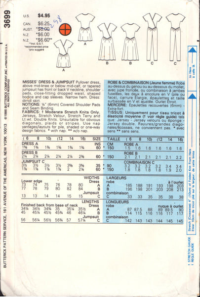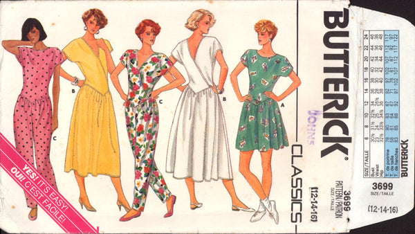 Pullover dress, above mid-knee or below mid-calf, or tapered jumpsuit has front or back V neckline, shoulder pads, close-fitting dropped waist, shaped bodice and cap sleeves. Dress: dirndl skirt.
