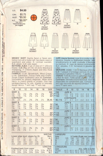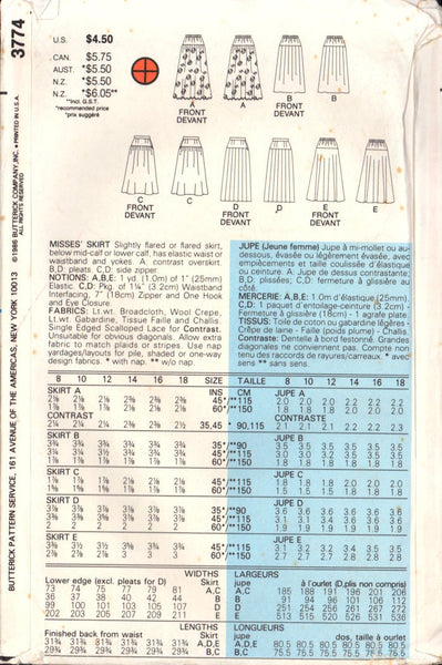 Butterick 3774 Sewing Pattern Skirt Size 10 Uncut Factory Folded