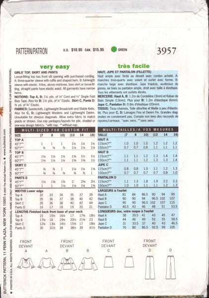 Loose fitting top has front slit opening with purchased cording, A: three-quarter sleeve with ruffle and shaped hem. B: full length sleeve with elastic. A-line above mid knee bias skirt or loose fitting straight pants have elastic waist. All garments have narrow hems.