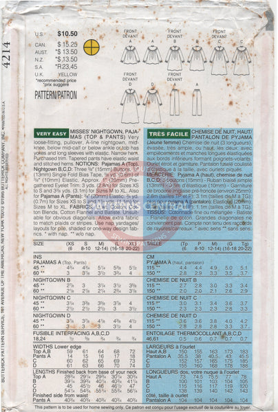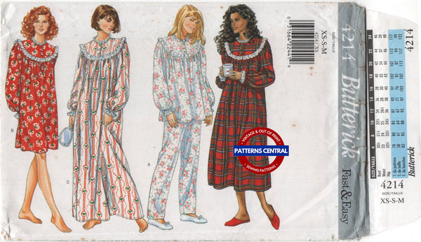 Very loose-fitting, pullover, A-Line nightgown, mid-knee, below mid-calf or below ankle or top has yokes and long sleeves with elastic. Narrow hem. Purchased trim. Tapered pants have elastic was it and stitched hems.