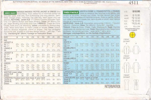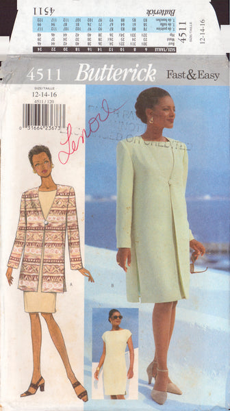 Butterick 4511 Sewing Pattern, Misses' Petite Jacket & Dress, Size 12-14-16, Uncut, Factory Folded