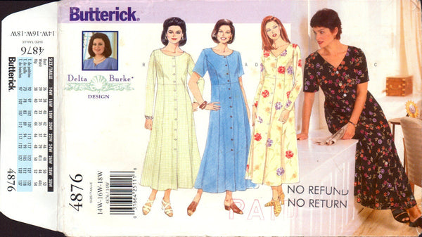 Dress, above ankle, has neckline variations, loose-fitting bodice, tie ends, flared skirt, princess seams and above elbow or long sleeves. C: side slits.