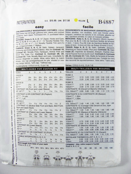 06 Butterick 4887 Child's/Girls' Masquerade Dress with Full Length Gathered Skirt, Uncut, Factory Folded Sewing Pattern