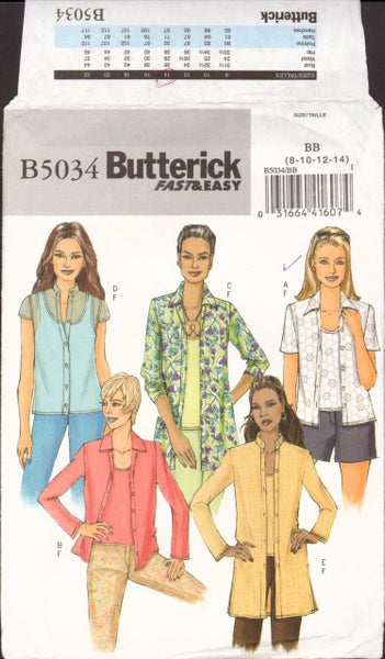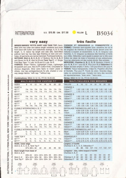 Semi-fitted shirt has collar and sleeve length variations and mock front band with button and button-hole closings. A, B, D; hip length. C, E; below hip length and side slits. Semi-fitted pullover tank top has bias tape finishing at neck and armholes. All garments are narrow hemmed.