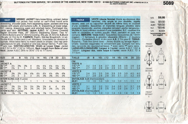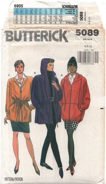 Very loose-fitting, unlined, below hip jacket has collar or self-lined hood with drawstring, shoulder pads, front separating zipper, pockets and long sleeves with pleats and buttons cuffs. A. drawstring at lower edge. B, C casing, drawstring waist and stitched hems.