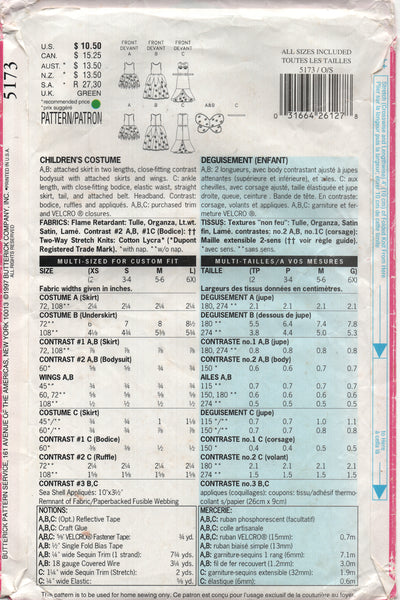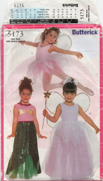 A,B attached skirt in two lengths, close fitting contrast bodysuit with attached skirts and wings. C: ankle length, with close fitting bodice, elastic waist, straight skirt, tail and attached belt. Headband. Contrast bodice, ruffles and appliques. ABC purchased trim.