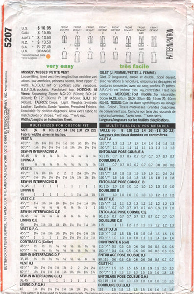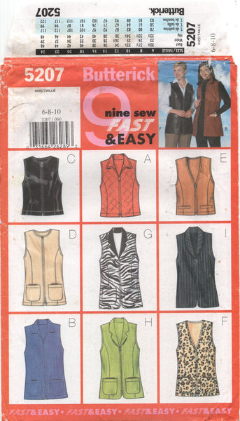 Loose-fitting lined vest in two lengths with neckline variations, low armholes, princess seams, front zipper. E: welts. A, B, G, H, I: self or contrast collar variations. B, D, F, G, H: pockets.