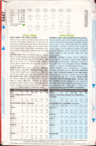 Butterick 5447 Sewing Pattern, Girls' Shirt, Pants, Top and Skirt, Size 12-14-16, Cut, Complete
