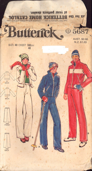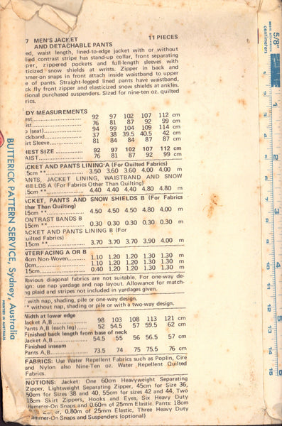 Fitted waist length, lined to edge jacket with or without applied contrast stripe has stand-up collar, front separating zipper, zippered pockets and full length-sleeves with elasticized snow shields at wrists. Zipper on the back and hammer on snaps in front attach inside waistband to upper edge of pants. Straight legged lined pants have waistband, mock fly front zipper and elasticized snow shields at ankles. Optional purchased suspenders. Sized for nine-ten oz. quilted fabrics.