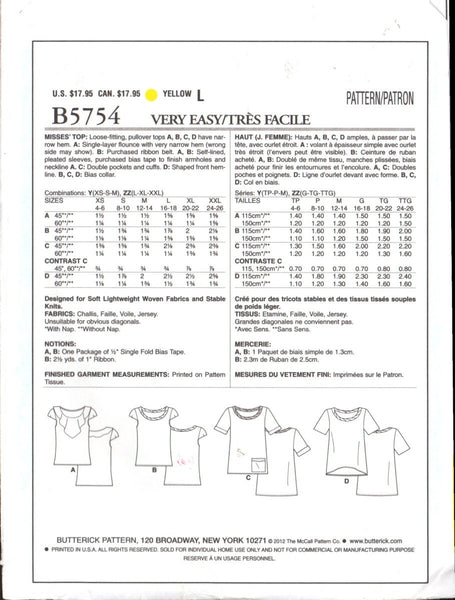 Butterick 5754 Women's Tops, Uncut Factory Folded Sewing Pattern Size 4-14