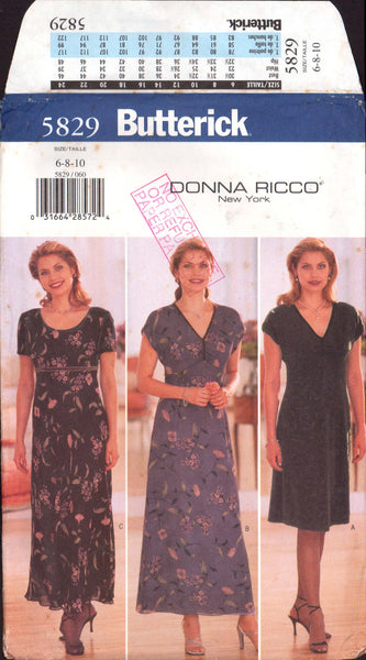Lined dress, mid-knee or above ankle, has raised waist, A-line skirt, back zipper and purchased trim. A, B: loose-fitting bodice and cap sleeves. Version C has fitted bodice and above elbow sleeves.
