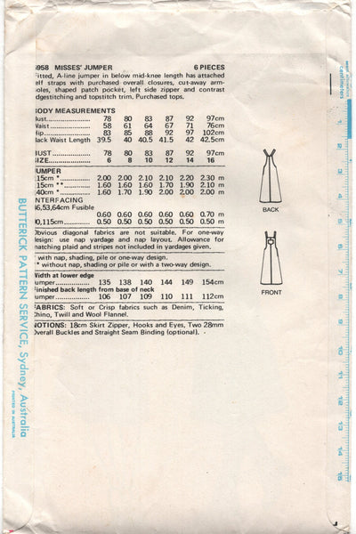Fitted, A-line jumper in below mid-knee length, has attached self straps with purchased overall closures, cut away arm holes, shaped patch pocket, left side zipper and contrast edge-stitching and top-stitching trim. Purchased tops.