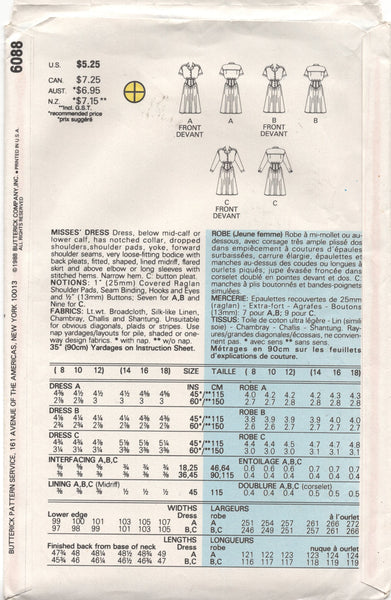 Dress below mid calf or lower calf has notched collar, dropped shoulders, shoulder pads, yoke, forward shoulder seams, very loose fitting bodice with back pleats, fitted, shaped, lined midriff, flared skirt and above elbow or long sleeves with stitched hems. Narrow hem. C: button pleat.